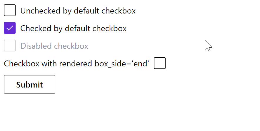 boxSidestringstartAllows you to set the checkbox to be at the before (start) or after (end) the label.